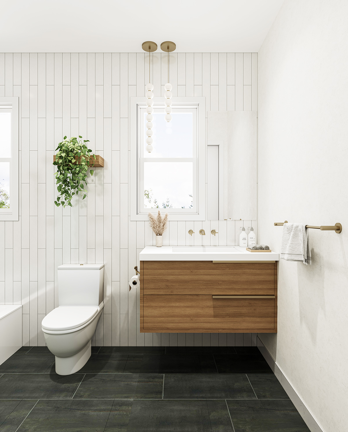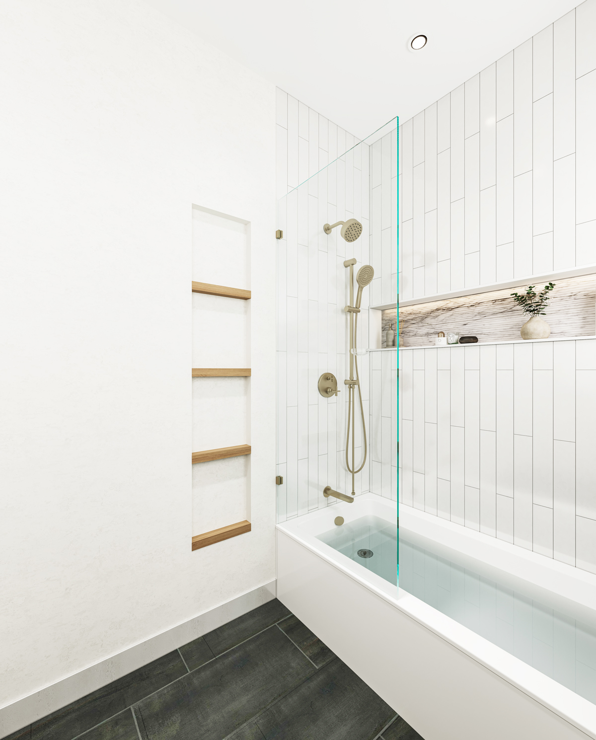 At the heart of Sierra Oak is a balance of strength and softness. The rich woodgrain vanity, floating oak shelving, and honed marble textures echo organic elements, while luxe brushed nickel fixtures by Brizo add a clean, sculptural edge. Matte porcelain wall tile and deep charcoal flooring give the space a quiet visual contrast, grounding the room without overwhelming it.